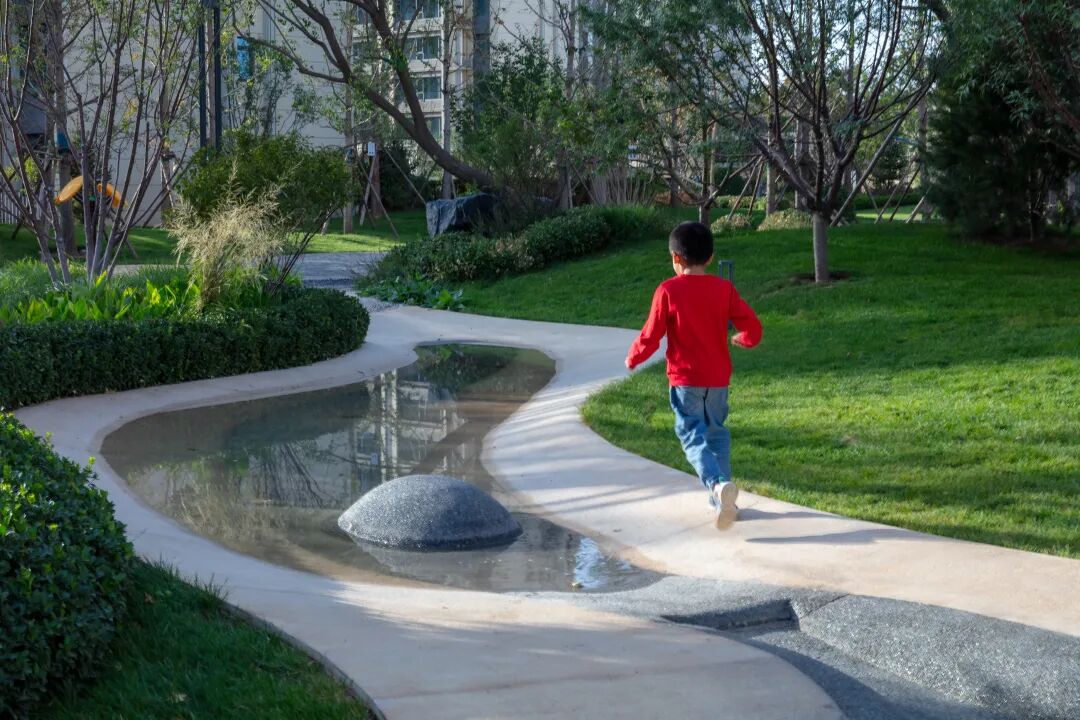 自然跌水与柔和灯光,让归家路上充满温馨。