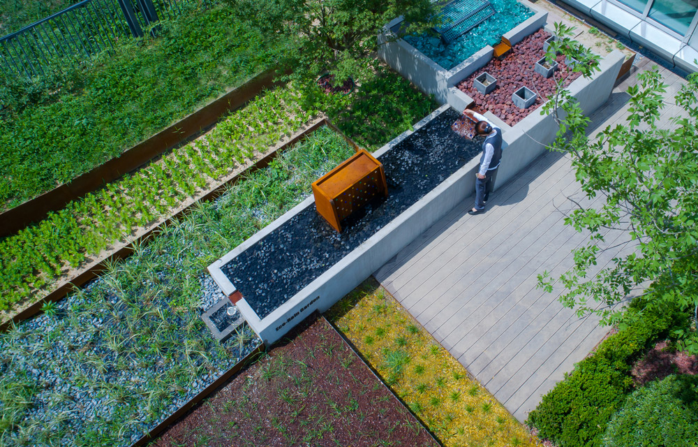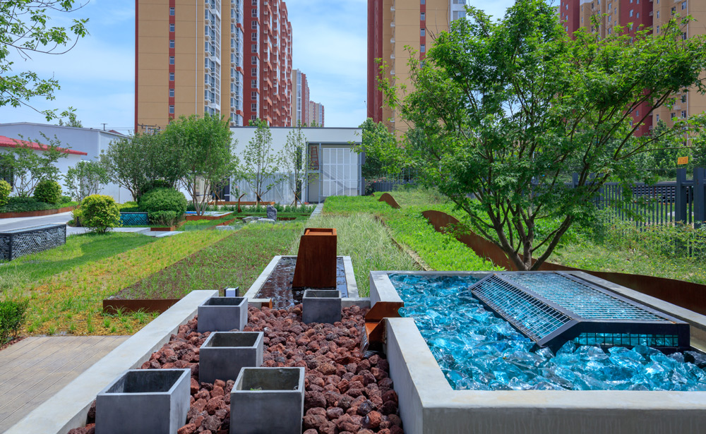 “雨水街坊”,是阿普贝思“雨水花园”的升级版,是适合一万到十万平米级别的社区、园区和街区等具有生态和文化需求的景观。
